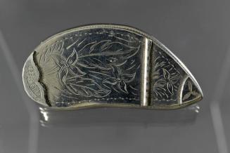 DescriptionSmall boat shaped snuff box is rounded on one side and flat with a hinged lid on the other side. Lid is decorated with floral and leaf engravings while the other side has a band of decoration at the upper edge.Status