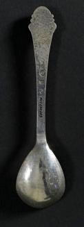DescriptionSpoon has an oval bowl, and a flat finely hammered handle with a foliate terminal inset with an amber coloured cabachon.Status