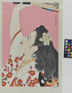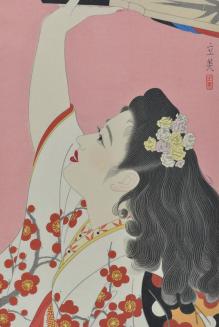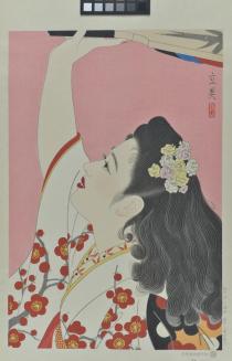 DescriptionA beauty with long hair and a racquet in her right hand proper, is playing battledore and shuttlecock
