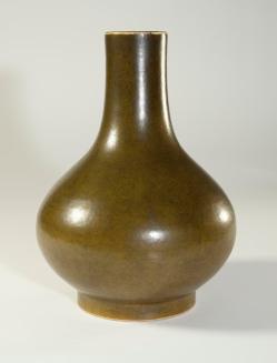 DescriptionLarge vase with round bullbous body with short straight foot and a tall tapered neck that is straight with no rim at top. Green glaze on exterior and interior and underside of base. Glaze is a lighter colour on neck rim.Colour: green