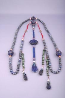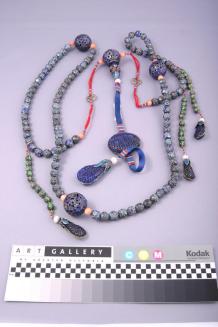 DescriptionNecklace consists of: 108 metal beads with blue enamel; 10 large blue enamel beads; 10 coral beads; 5 pearls; 3 short strands of green glass and enamel beads (30 beads in total); 5 metal discs; ribbon and cordColour: blue;green;red;coral