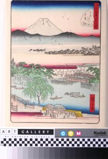 DescriptionCity scene with canal or river with people and boats and buildings. Snowy mountain peak (Fujiyama) in backgroundColour: multi-colour