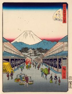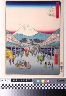 DescriptionStreet scene with snowy peak of Fujiyama in the background. Surugacho was a commercial centre in Edo. The street, showing many people and porters is flanked on either side by shops, including the great trading house of Mitsu, which is now Japans second-largest trading company.Colour: blue;multicolour