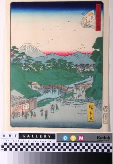 Descriptionstreet scene with Fujiyama in background, river with bridge and people in foregroundColour: blue;green;red;yellow
