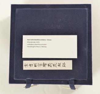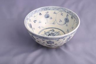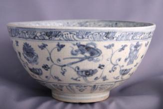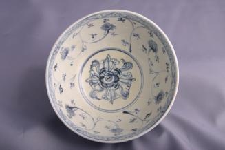 DescriptionCream coloured bowl with curved sides and short foot has delicate blue underglaze designs: interior with lotus scroll band below a narrow diamond band at rim and central double vajra; exterior with lotus scroll band and the 8 Buddhist emblems, below narrow band at rim and spiral band at foot.Colour: white; blue