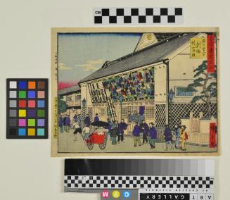 DescriptionKabuki theatre (Shintomi-za) building with banners and pictures decorating the front and pedestrians and rickshaw in the street.Colour: multi-colour