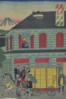 Descriptionprint depicts a western style building with a horse drawn carriage in front on the street; people can be seen on the interior of the building; pedestrians on the street; Mount Fuji is in the background;Status
