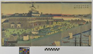 Descriptiontriptych print; scene with a large western style building and accompanying garden; canal or waterway with boats at the lower right; people in the garden; Mt. Fuji in the background;Status