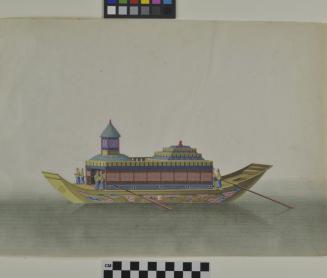 DescriptionChinese export painting; image depicts a large boat with long sets of oars at either end and a large colourful central covered area;Status