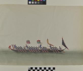 DescriptionChinese export painting; image depicts a long narrow boat with a dragon's head prow, filled with seated men pulling oars and four standing men beating drums; two flags and two canopies;Status