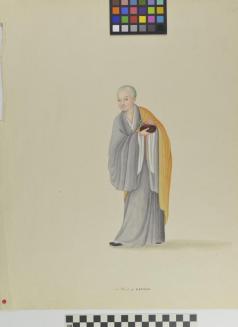 DescriptionChinese export painting; standing portrait of a preist with a shaven head, wearing a grey robe with a yellow cape and holding a red bowl;Status