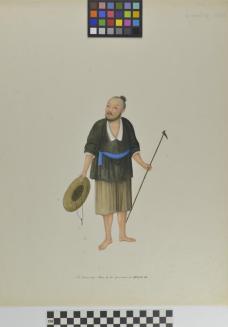 DescriptionChinese export painting; standing portrait of a man wearing a brown skirt, short black jacket with a blue sash, and carrying a long stick-like instrument in his left hand proper and a straw hat in his right.Status