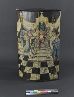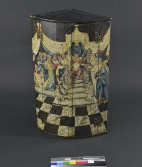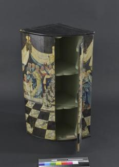 DescriptionHanging corner cabinet is bow-fronted, the exterior painted with a 'baroque' scene of historical figures gathered in attendance before a king, seated on his throne; cabinet has two locking doors in front, fitted with ornate hinges and a key with keyhole plate in brass; interior is painted green has two central shelves and a hook and eye on one door;Status