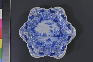 Descriptionhexagonally shaped plate with a lobed and raised rim; interior is decorated with blue and white decorative motifs, raised foliate sprigs and a landscape with architecture in the centre;Status