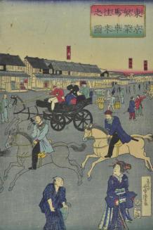 DescriptionBusy city scene with pedestrians, people on horseback, horse pulled cart and buildings in the backgroundStatus