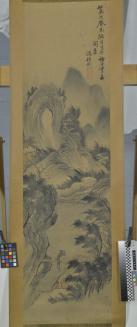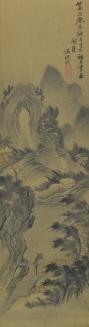 Descriptionlandscape depicting a mountainous valley with buildings and a figure on a bridgeStatus