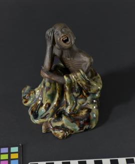 DescriptionFigurine depicts a seated man with a robe of brown, green and ochre, around his waist exposing his upper torso and revealing his protruding ribcage. His mouth is open in a gesture of distress and one of his hands is on his forehead.Status