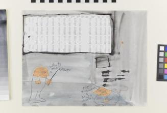 Descriptionfreehand sketch of two figures standing in a room, directly above which is displayed a block of numbers printed directly on to the paper.