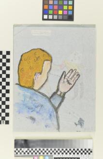 Descriptionfigure in the foreground is depicted from the back holding a small human figure in his left hand, a small piano is sketched in the BRC. the primary layer is of green construction paper, upon which is the image of a male figure, barely visiable through the fine white paper.Status