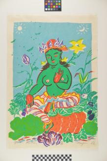DescriptionGreen female figure seated upon what appears to be a pumpkin amounst foliage. Left hand is raised to the middle of her chest, and is holding the stem of a yellow lily between her thumb and ring finger. She is wearing a crown of purple petals. The image is placed upon a blue background, with a white sun in the TLC and a white moon in the TRC.Status