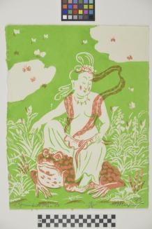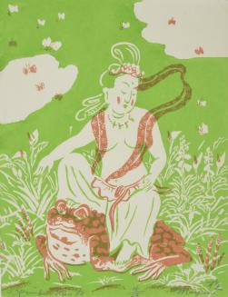 DescriptionImage depicting a goddess seated on a toad. Green background with foliage, butterflies/ insects in the sky.Status