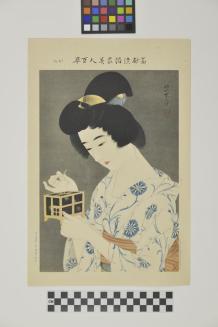 Descriptionfemale figure in a blue floral robe holding a rectangular box in her hands;