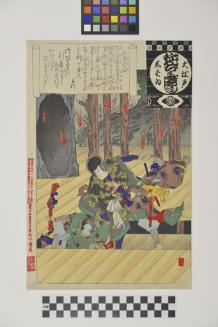 Description"Oh Edo Nenju Gyoji Shibai" (Annual Events of the Theatrical Year in Great Ado). A set of 25 designs, 23 by Ginko and 2 by Torii Kiyosada. "Omemie". Actor in a fighting scene is rising up on a "seri-age" (lifting trap" to stage level in his introductory performance (omemie: debut).Status