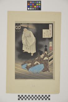 Description"Tsuki Hyakushi; Sumiyoshi no Meigetsu" ("One Hundred Aspects of the Moon; Sumiyoshi Full Moon"). Lord Teika, who compiled "Hyakunin Isshu" (100 Poems by 100 Poets), is falling asleep in a Shinto shrine at Sumiyoshi. This shrine was dedicated to the god of poetry. The god appeared in his dream as an old man.Status