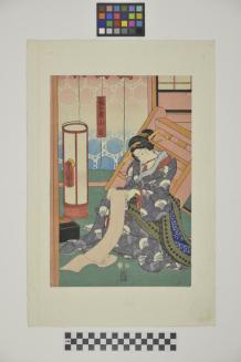 DescriptionCourtesan Koman is writing a letter next to a large "andon" lamp in a living room.Status