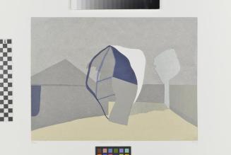 DescriptionLandscape with green tree shapeColour: blue; dark blue grey; ochre; grey; grey umber; pale grey green