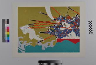 DescriptionThe artist's depiction of the famous battles of the Genji clan and the Heike clan. The court officials, the members of the Heike clan, committed suicide by throwing themselves into the water. The young emperor Anntoku, 7 years old, is held by his grandmother as she jumps into the water.Status