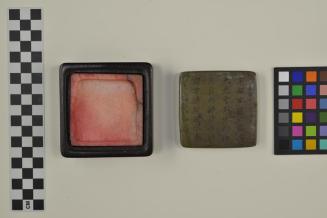DescriptionSquare inkstone, with removable metal lid displaying untranslated inscription.Status