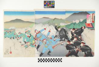 DescriptionTriptych depicting Japanese troops in battle, charging in from the right. Two colour coats applied.Status