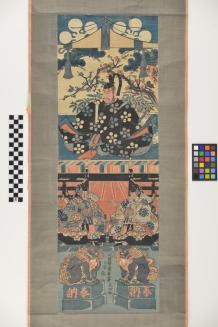 Descriptionone scroll with two woodblock prints. Upper image depicts a seated samurai?, with Japanese cherry blossoms in the background. The bottom image is of two seated samarui?Status