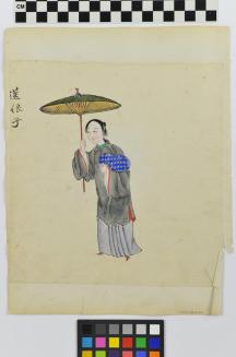 DescriptionSide A depicts a man with a blue sac draped over his left shoulder. Side B depicts a woman holding a parasol.Status