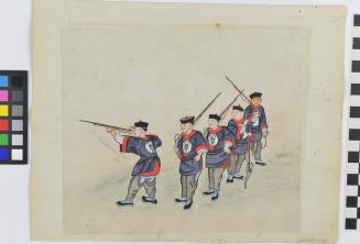DescriptionSide A depicts two men with caged ducks and chickens. Side B depicts five soldiers holding guns.Status