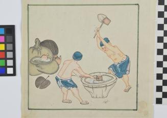 DescriptionSide A depicts a blind musician being led by a child. Side B depicts two men pounding rice.Status