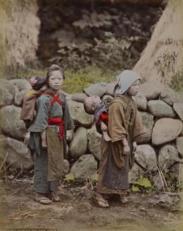 DescriptionTwo young girls are pictured carrying babies on their back.Status