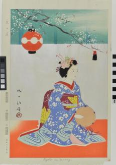 DescriptionKneeling beauty playing a tambourine. Lantern hangs from flowered tree branch overhead.Status