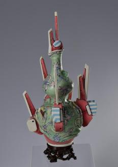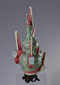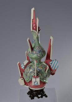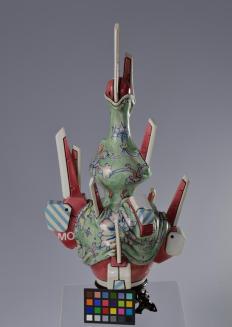 DescriptionWhat looks like a traditional hand-painted Chinese vase, with green floral design, is draped over cyber-pop ceramic futuristic robotic prosthetics of red, blue, and white.Status
