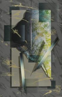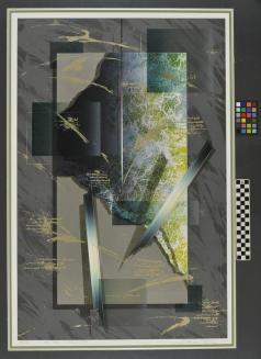 DescriptionAbstract print. Geometric shapes. Green, blue, purple, grey, brown.Status
