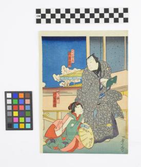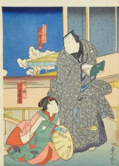 DescriptionArashi Rikan III is in the role of the merchant Yamagata-ya Gihei and Kataoka Tsuchinosuke I as imoto musume (the younger sister). Toyohide's prints are very rarely encountered.Status