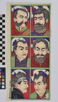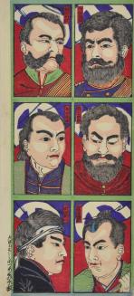 DescriptionPrint depicting six rebel samurai from the famous Satsuma Rebellion in 1877. Each portrait is set against a red background with a purple drape above, featuring the crest of the Satsuma clan, which was used by the rebels. The leader of the samurai, Saigo Takamori, is shown at upper right, wearing a purple military uniform trimmed with gold braid. The man at lower right wears traditional kimono, his hair pulled back into a low topknot.Status