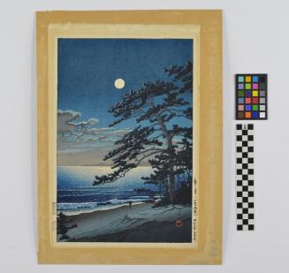DescriptionThe light of the full moon is reflected on the clouds, water, waves and shore. A large tree in silhouette leans in from the right edge across the image plane and reaches upwards to the moon. Below a person walks along the shoreline.Status