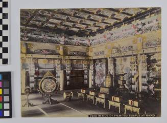 DescriptionScene of the elaborate interior setting of the Iyemitsu Temple at Nikko. The gong, drum, and other instruments are featured at the BL. Each tile on the ceiling is decorated with the figure of a dragon.Status