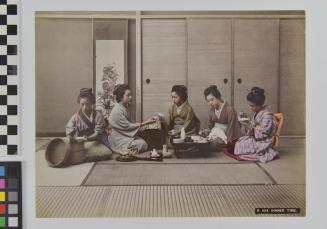 DescriptionIn this studio photograph the young ladies are seen enjoying a meal. The young lady to the left is scooping rice from a bamboo steamer basket. The next young lady is being served sake. There is a tea set and a table in the center of the photo. Of the 2 young ladies to the right, one is eating rice and the other noodles. They are all seated on Japanese tatami mats.Status