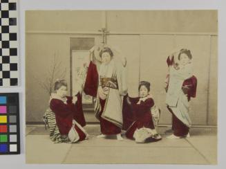 DescriptionIn this image, taken in a studio, the young ladies represent Geisha. They are demonstrating the various steps in Japanese dance. The scroll in the back is from the Stillfried studio. Each young lady is beautifully attired in multiple kimono and tabi socks. Their kimono have the style of sleeves of an unmarried women.Status