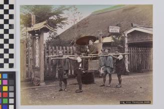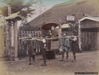 DescriptionThis kago is in the style of a sitting chair as opposed to the other, hanging basket style. Here the passenger carries as umbrella to keep out of the sun.Status