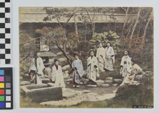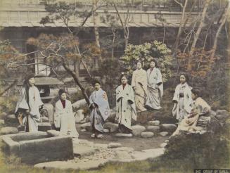 DescriptionThis photograph was taken in Yokohama, in the garden in the back of the house of prostitution known as the No. 9. The working girls shown here have their obi's untied. Some have their hair hanging loosely on their shoulders.Status