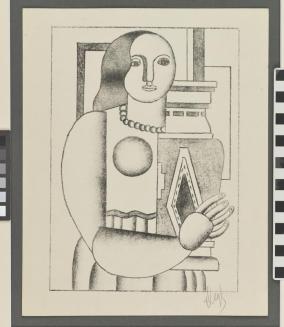 DescriptionImage of a woman holding a vase. Black and white with discreet shading, especially in her face.Status